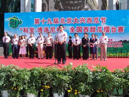 25日,由大兴区人民政府主办、大兴区庞各庄镇人民政府承办、博洛尼家居用品(北京)有限公司独家赞助的第十九届北京大兴西瓜节科宝.博洛尼杯全国西甜瓜擂台赛拉开序幕。大兴区副区长李春亭、大兴区政协副主席路志权等领导参加。