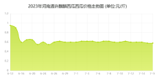 2023年6月12日至2023年7月17日,河南通许麒麟西瓜西瓜价格总体呈现下跌趋势,期初报价0.95元/斤,期末报价0.58元/斤,下跌了39%。其中,最高点6月12日报价0.95元/斤,最低点6月22日报价0.55元/斤。