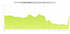 2023年3月21日至2023年7月21日,河南夏邑麒麟西瓜西瓜价格总体呈现下跌趋势,期初报价2元/斤,期末报价1.9元/斤,下跌了5%。其中,最高点5月22日报价2.2元/斤,最低点7月2日报价0.5元/斤。