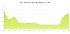 2023年6月18日至2023年7月19日,江苏西瓜价格总体呈现下跌趋势,期初报价1.3元/斤,期末报价1.2元/斤,下跌了8%。其中,最高点6月19日报价1.3元/斤,最低点6月28日报价0.35元/斤。